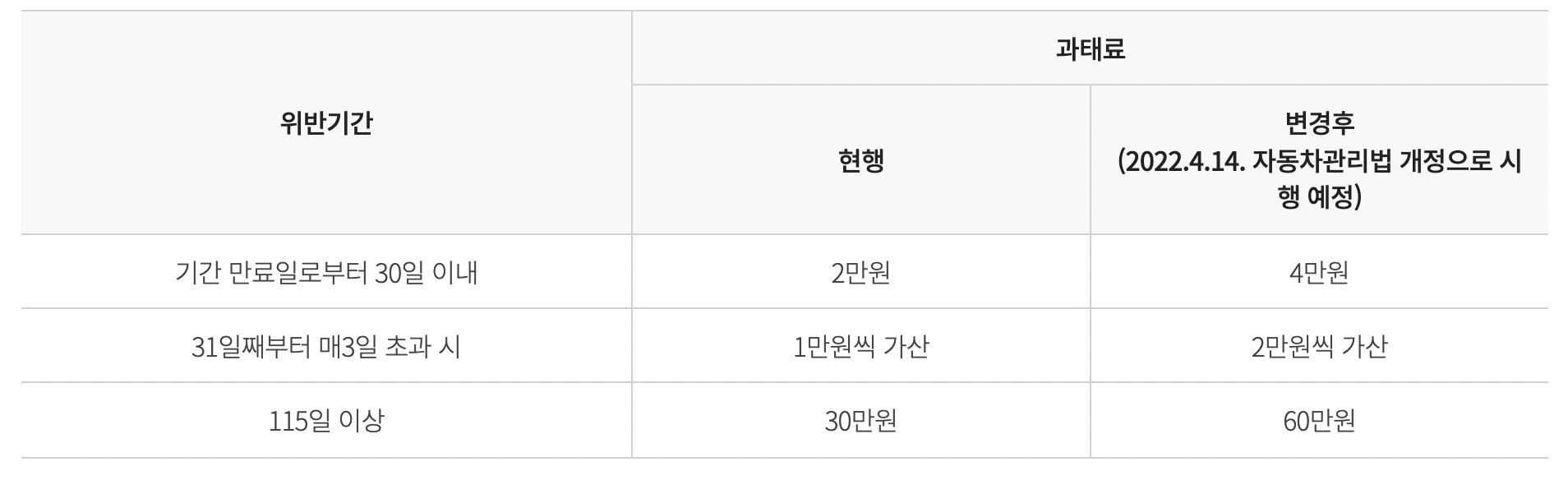 그리고 30일 이후 3일마다 금액이 2만원씩 늘어나게 되며 최대 과태료 금액이 60만원으로 늘어나는 것입니다.