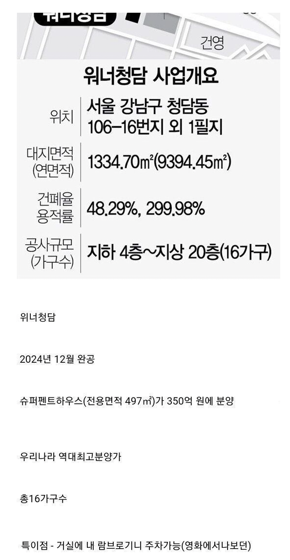 강남구청은 2021년 11월 24일 "워너 청담"의 건설을 승인했다고 말했습니다. 이 단지는 지하 4층~지상 20층 규모로 총 16세대가 입주 예정입니다.